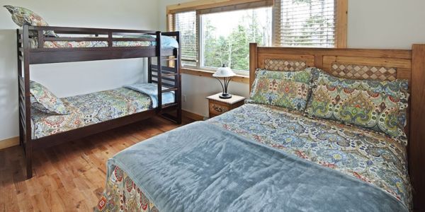 Le salon principal, largement fenestré avec double toits cathédrales en pin noueux, est équipé d’un foyer au propane et orné d’un panache d’orignal chassé par les propriétaires.
